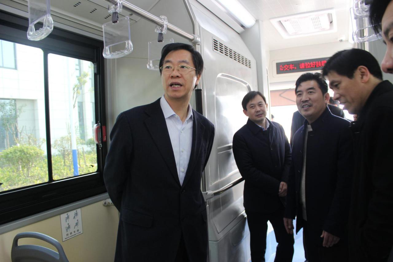 (图为远致达总经理谈达宏向盐城市委常委、常务副市长庄兆林一行介绍无轨电车)